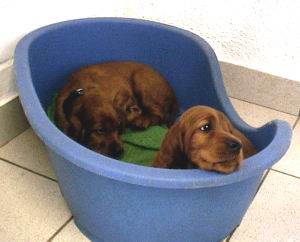 Benjury's Nachkommen: Nun sind sie genau 7 Wochen alt. Ich besuchte sie mit Benjury und stellte fest, dass sie genau so albern und ulkig sind wie ihr Hundevater.