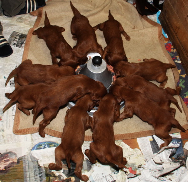 01.03.2010: Nun wird schon gerangelt und gespielt, auch das Fressen gelingt schon gierig aus dem Rundnapf!!!!1