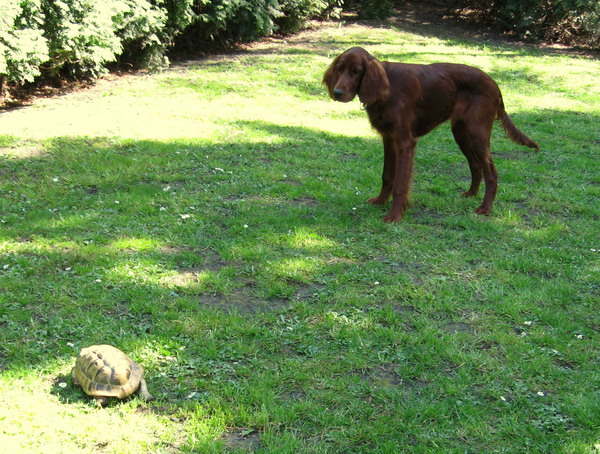 Bho-Ghy übt für die große Europa-Sieger-Zuchtschau (ESZ) in Dortmund, wo er in der Jüngstenklasse gemeldet ist 15.04.2007 Nun darf er endlich wieder spielen..... Die Schildkröte war ihm jedoch nicht geheuer!
