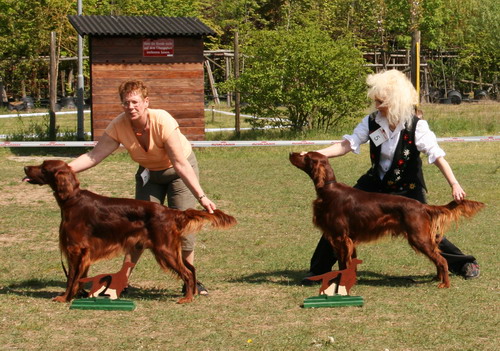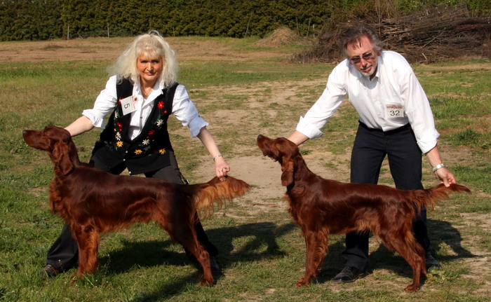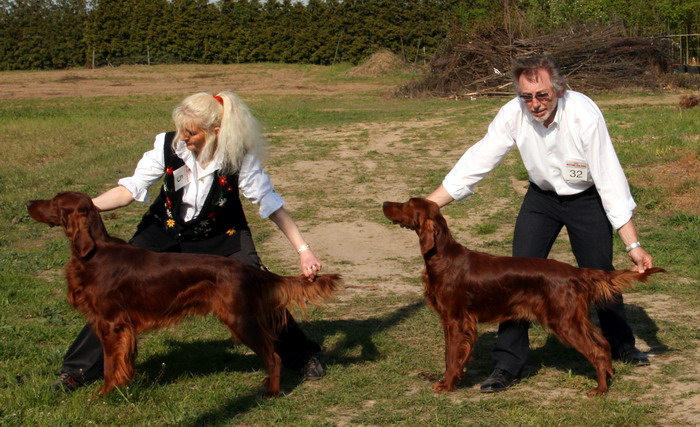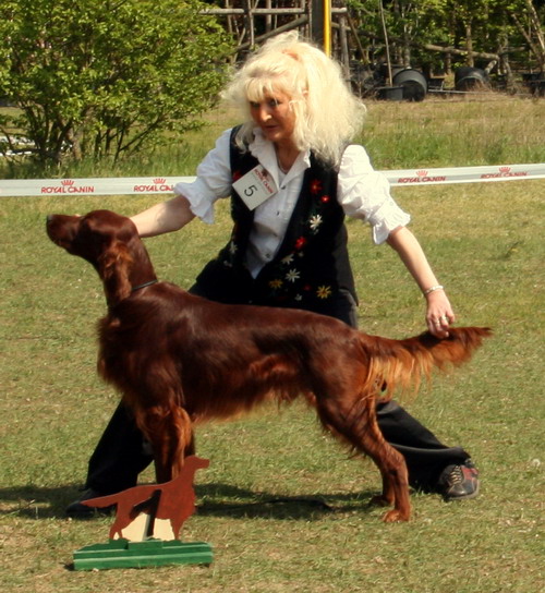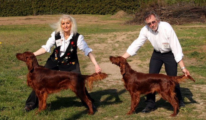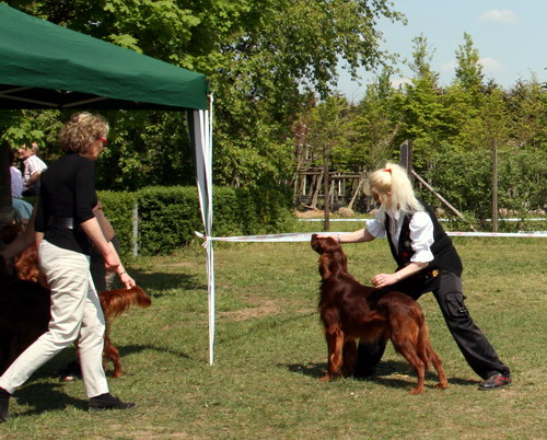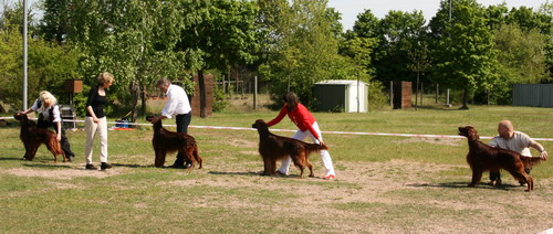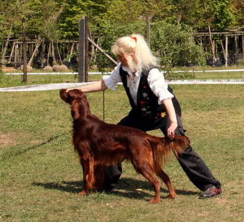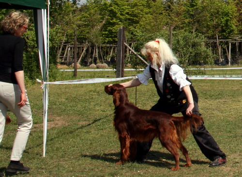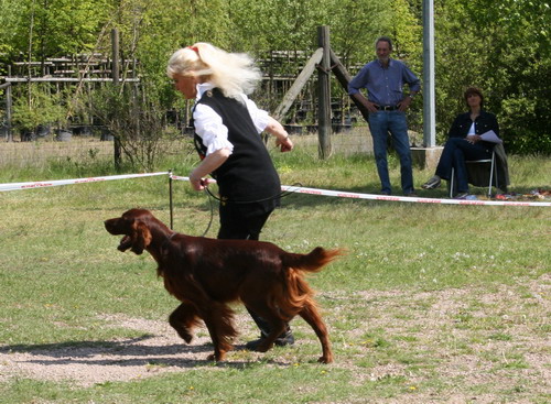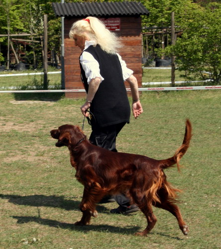 1 1/2 Jahre alter, eleganter Vertreter seiner Rasse; sehr schöner Kopf; korrekte Kopfparallelen; vorzügliche Vorbrust und Brusttiefe; korrekte obere und untere Linie; sehr gute Winkelungen; gepflegtes, kastanienfarbenes Haarkleid, frei von Locken und Wellen; harmonischer, temperamentvoller Bewegungsablauf;