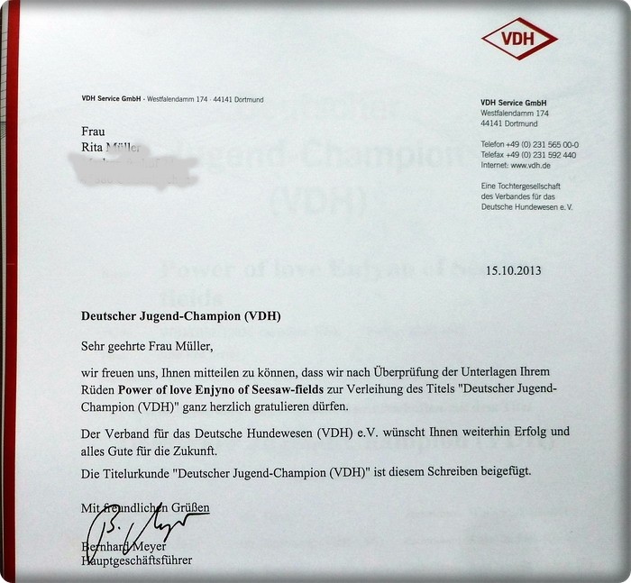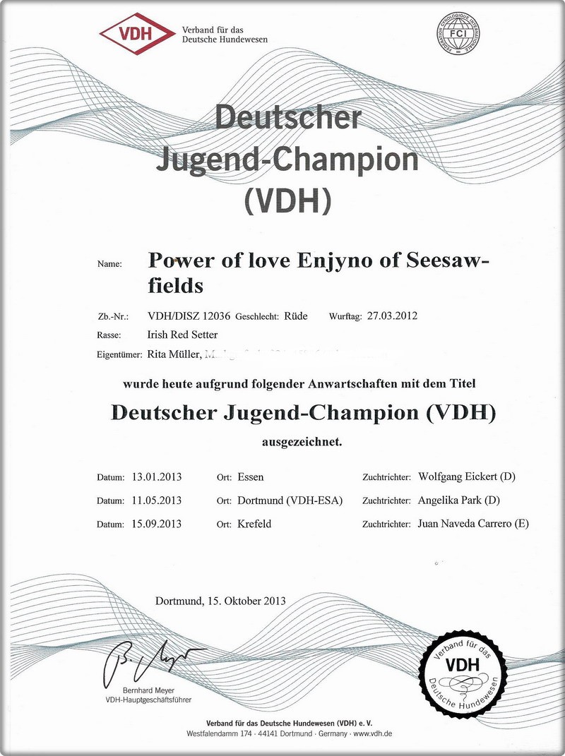 Belege des VDH, erhalten am 17.10.2013 Hiermit ist Power of Love Enjyno of Seesaw-fields: Deutscher Jugend-Champion (VDH)