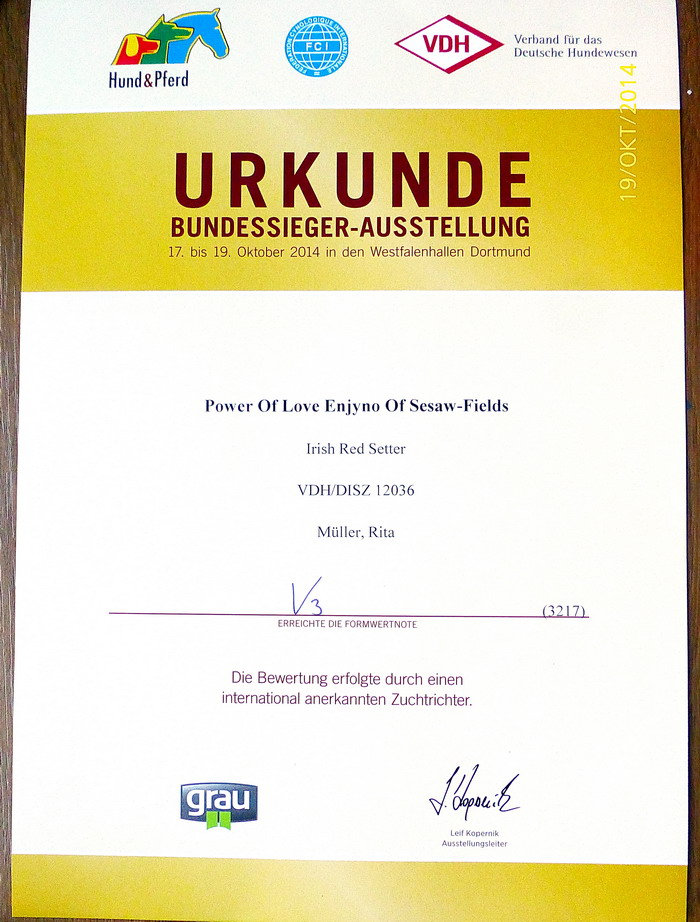 18.10.2014 Bundessieger & Internationale Ausstellung in Dortmund Enjyno erhielt in seiner Klasse "OFFENE KLASSE" den 3. Platz ein > Vorzüglich 3