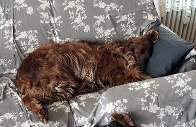 Im Februar hat sich nämlich meine Schäffin ganz spontan entschieden, dass wir wiedermal nach Bad Füssing fahren. Sie war ja schon öfter mal dort, ich zuletzt vor 4 Jahren - aber natürlich habe ich mich gleich wieder ausgekannt! Und natürlich hatte ich dort auch wieder ein Sofa - fast ganz allein für mich. Meine Schäffin hat wieder Bettbezüge draufgelegt und diesmal hatte ich sogar eine extra Stufe, damit ich nicht von so hoch herunterspringen muss. (Naja, sie möchte es halt nicht - weil es nicht gut für meinen Rücken ist. Sagt sie!)