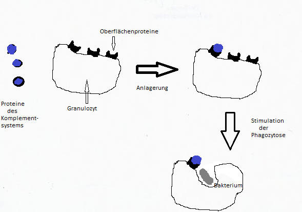 Sie übernehmen die sog. unspezifische Abwehr gegen eingedrungene Bakterien und Viren. Sie zirkulieren frei im Blut und gelangen so sehr schnell an die Orte, an denen sie benötigt werden. Sie werden über Proteine (=Eiweiße) im Blutserum aktiviert, die in komplizierter Weise mit den Blutzellen zusammenarbeiten und die Phagozytose (das Einschließen bzw. Umschließen der Erreger mit anschließender Auflösung) stimulieren. Diese Proteine werden als Komplementsystem bezeichnet (Komplement=Ergänzung). Die Stimulation erfolgt durch Anlagerung dieser Proteine an bestimmte Oberflächenbereiche der Granulozyten, die ebenfalls durch Proteinstrukturen gebildet werden. Zwei Proteinstrukturen zur Ausbildung dieser Oberflächenstrukturen fehlen bei dieser Krankheit.