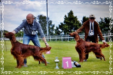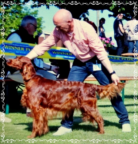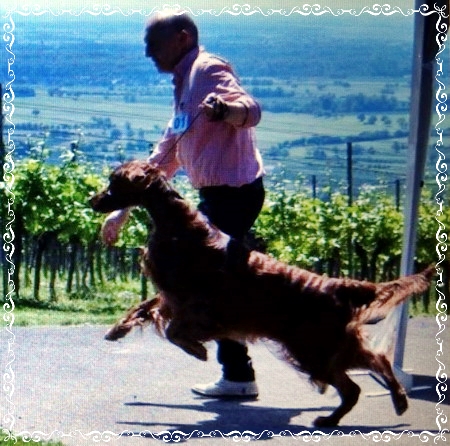 Der Wunsch, einen Irish Setter zu besitzen, entstand in meiner Kindheit. Gegenüber von meinem Elternhaus wohnte ein englischer Offizier, morgens wurde er mit einem Dienstwagen abgeholt, kurze Zeit später ging die Ehefrau mit den beiden Irish Setter Rüden Jack und Maddock spazieren und für mich war es das größte diese Hunde zu streicheln. Für mich festigte sich der Traum, eines Tages solch einen Hund zu besitzen und der Traum wurde wahr. Claudi und ich machten uns auf die Suche und wurden bei Frau Dr. Stephanie Klinge- Wipfelder fündig, ein Familienmitglied sollte er sein, sowie man es sich vorstellt. Es war uns vergönnt auch den Vater von unserem zukünftigen Welpen kennenzulernen auf einer Ausstellung, ich dachte bei dem Anblick nur was für ein kräftiger Kerl ist das denn. Acht Wochen später zog Miles bei uns ein und auf ihn wartete eine Dackeldame namens Abby, sie hatte in der Welpenzeit ihre liebe Not mit dem Knaben. In der Hundeschule war Miles schon sehr speziell, das normale Training in der Hundeschule interessierte ihn nicht sonderlich. Nach gut zwei Monaten sagte unsere Trainerin, dass Miles eine andere Ausbildung benötigt; wir waren total verunsichert und dachten, wieso ist dieser Zwerg nicht auf uns fixiert. So begann eine jagdliche Ausbildung, obwohl wir keine Jäger sind und siehe da, unser Miles hat von da an seine Passion ausleben dürfen. Später wurde er im Feld von den Jägern als roter Teufel bezeichnet, zu uns Menschen war er ein total loyaler Freund. Seine zweite Größe war das Ausstellungswesen und er zog die Blicke auf sich mit seinem traumhaften Gangwerk, mitunter dachte ich, dass Miles mir einen Gefallen tut mit seinen grandiosen Auftritten, er selber hätte wohl niemals eine Ausstellung besucht, für ihn war das Leben in der Natur sein Mittelpunkt. Nach dem Erreichen vieler Titel haben wir ihn in den Adelsstand erhoben. Sir Miles hat auf 75 Ausstellungen 25 Mal das BOB (= bester Hund der Rasse) bekommen. Über die Jahre gesehen hat sich aus ihm ein Irish Setter entwickelt, von dem viele Menschen nur träumen.
