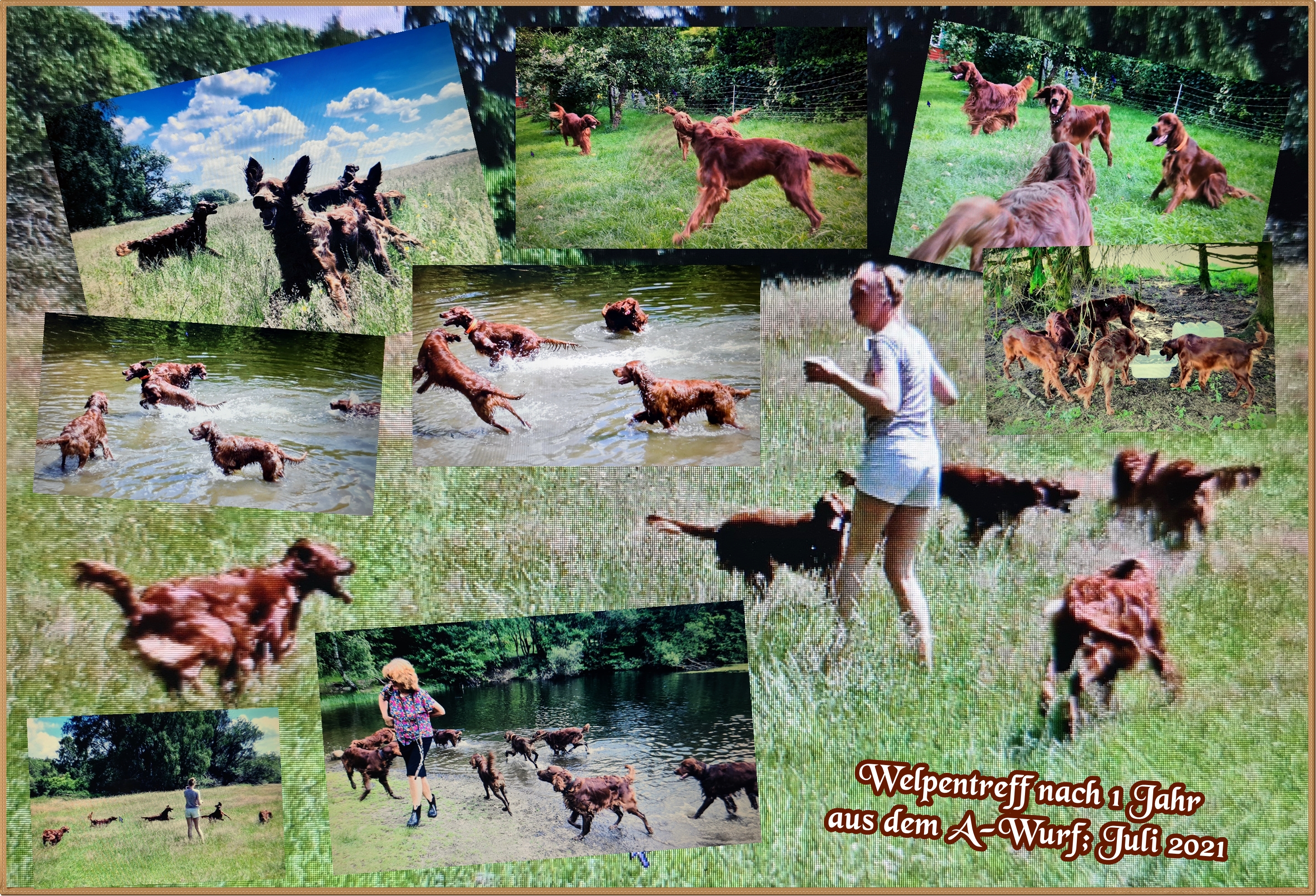 Die Wiese war bald ein wildes Gewusel von roten Flitzern. Zwischendurch kurze Rast im Schatten unter Bäumen, mächtiges Geschlabber aus den großen Waschbütten mit Wasser – und weiter ging das große Kräfte- und Geschicklichkeitsmessen. An den See gingen wir mit Leinen, dort hätten ja noch andere Menschen sein können. Welche Freude auch hier zu sehen, dass alle schon recht wohl erzogen sind und fein in der Kolonne mit ihren Besitzern bei Fuß gingen. Am See planschten dann alle nach Herzens- und Setterlust. Erste Schwimmversuche klappten auch schon!