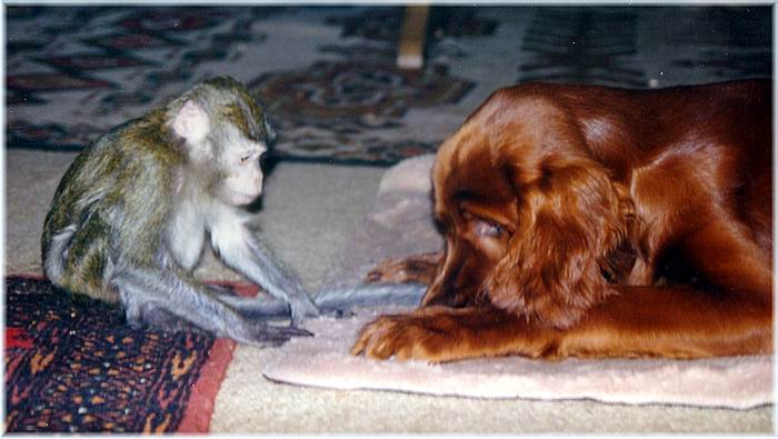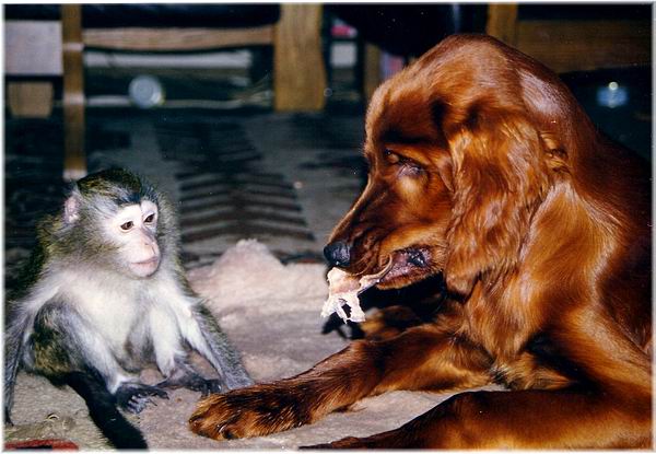 Mittlerweile fühle ich mich hier aber pudelwohl. Es wird in meinem Heim nie langweilig. Auf meinen Kauknochen muss ich immer tierisch aufpassen, gerade der Affe VIRGIL sitzt dann immer vor meiner Nase und versucht den richtigen Moment abzupassen, um dann mit seinem Diebesgut wieder zu verschwinden. Selbst meine Oma ABAQUAIL war bis zu ihrem letzten Tag des Hundelebens immer zum Stehlen bereit. TIMO ist der ewig wilde, denn Läppchen, Bälle etc. sind bei uns immer gefragt. Sind keine Lappen zu finden, nehmen wir einfach die Küchentücher zum Spielen und zerren. Frauchen und Herrchen hatten immer viel zu tun, bis ich erwachsen wurde. Timo ist leider nicht mehr so nett zu mir, aber ich wehre mich, sooft ich nur kann ... aber Frauchen hat für Ordnung gesorgt.