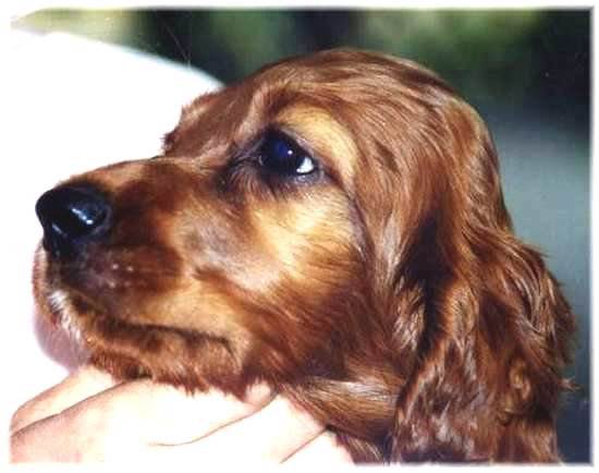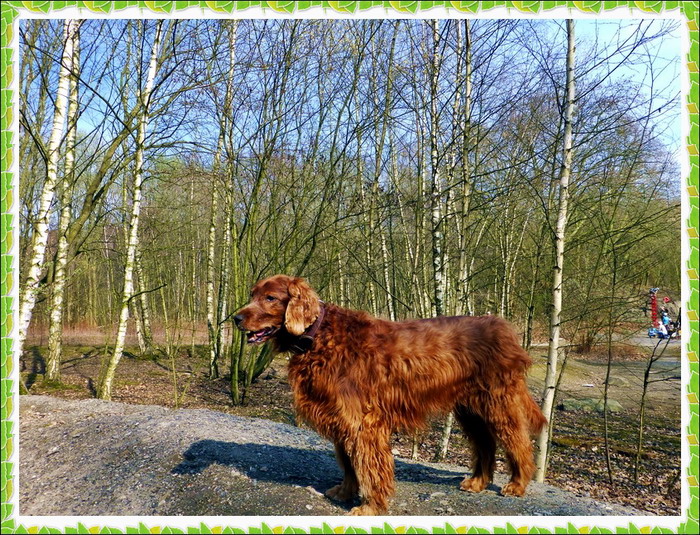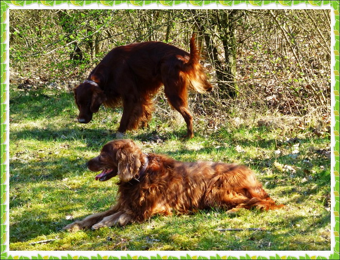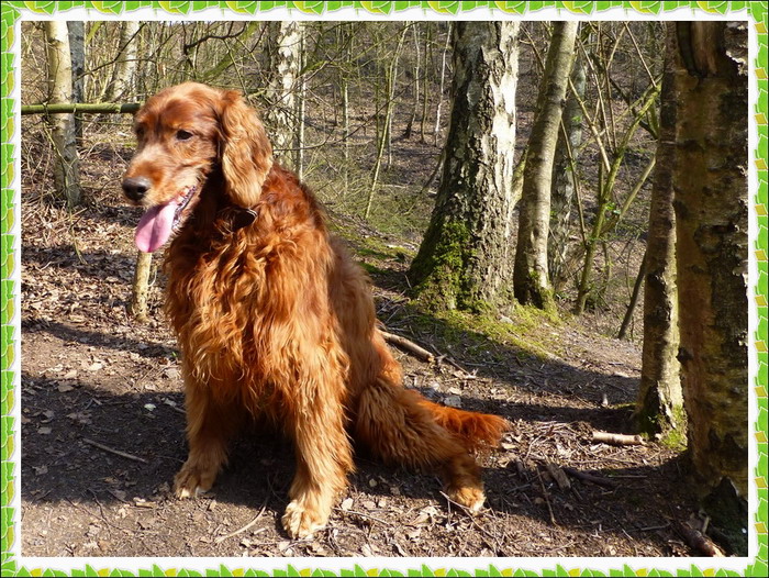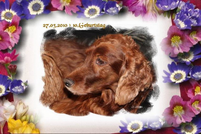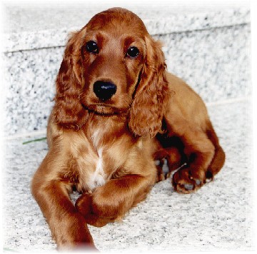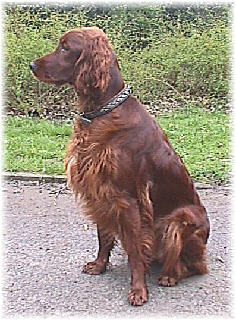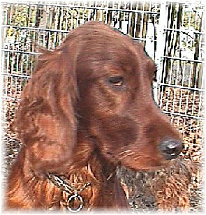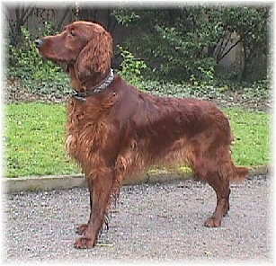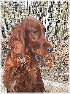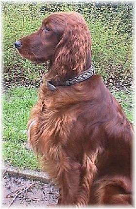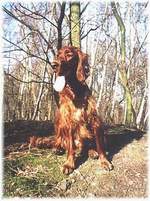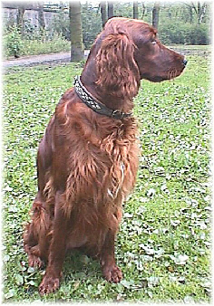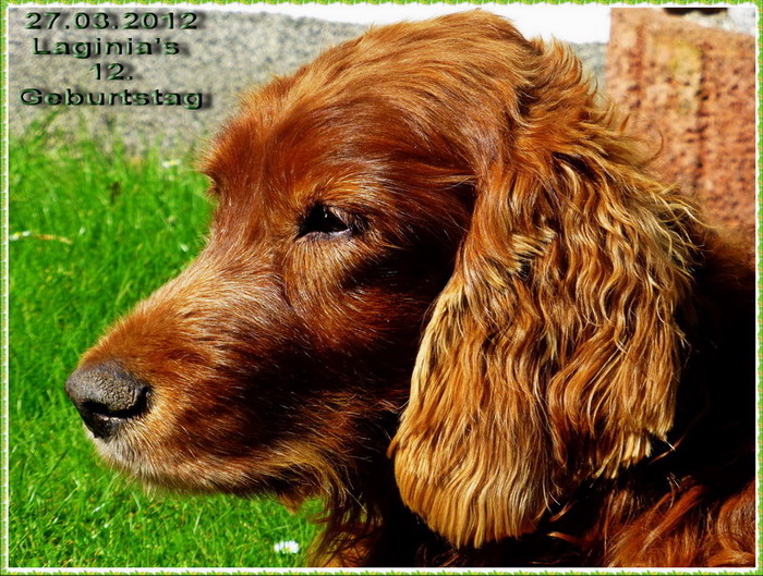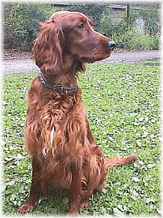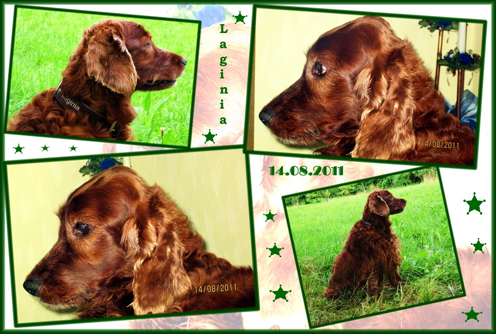 LAGINIA kam als Welpe, 8 Wochen, zu uns in die Familie. Sie zeigte von Anfang an keine Scheu und wirbelte alles durcheinander. Weder DONOVAN, noch die anderen Tiere konnten ihr Temperament bändigen. Allerdings zeigte sie gleich zu Beginn ihres Daseins ihre Gelehrigkeit, ihre Spitzbübigkeit, ihre Neugierde u.s.w. Mit Frauchen absolvierte sie eine entsprechende Hundeausbildung mit anderen Irish-Settern auf unserem Hundeplatz. Sie hat jedoch ihre wilde und ungestüme Art, ihre überschwengliche Freude anderen Tieren und Menschen gegenüber bis heute noch nicht abgelegt. Laginia ist einfach ein immer fröhlicher und ausgelassener, wilder Setter.