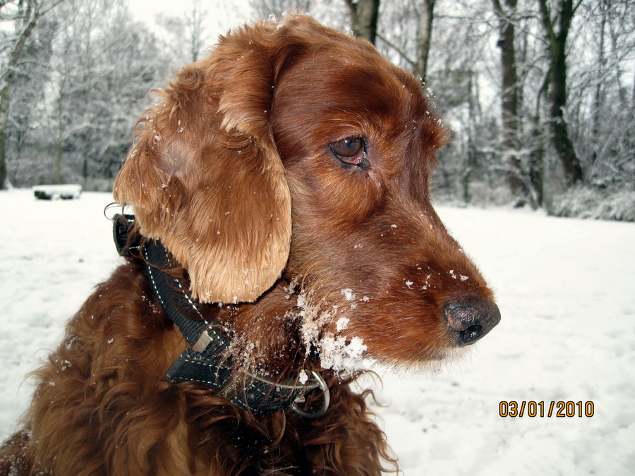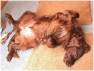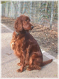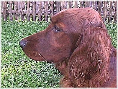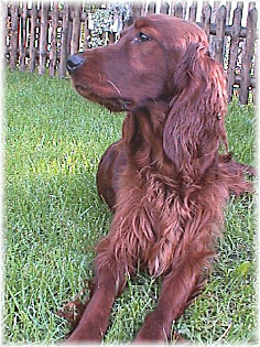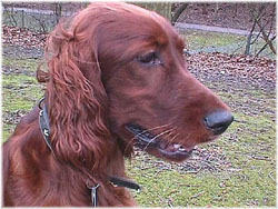 Leider hat mein Frauchen Ende des Jahres 2001 mein HD - Röntgenergebnis durch die Auswertezentrale des Irish-Setter-Club.e.V. erhalten und war sichtlich traurig, denn mit dem Ergebnis D 2 darf ich jetzt keine Hundebabys bekommen. Aber sie hat mich weiterhin sehr, sehr lieb und das merke ich als empfindlicher und sensibler Setter.... (re.: Foto vom 03.02.2002