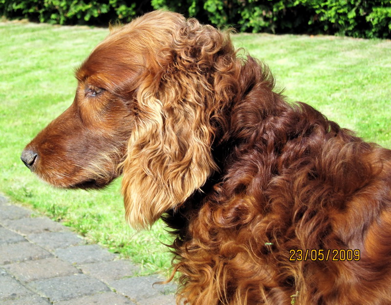 Übrigens, schnüffeln und die Erde nach vielen Gerüchen absuchen - das ist meine große Leidenschaft.....!!! Hundeplatz und Gehorsamsübungen, Ausstellungen und Prüfungen – all das musste ich auch noch absolvieren, aber ein wahrer Setter will ja seinem Frauchen oder Herrchen immer bei bester Laune halten und macht brav alles mit. Ach ja, ich musste nun für meine erste Ausstellung Stell- und Laufübungen durchführen und wurde auch das erste Mal in Nottuln von Thomas Hövener getrimmt. Meine schönen Haare sah ich nur so abfallen, aber meine Trauer verging schnell, als ich anschließend wieder mit anderen Hunden auf den riesigen Wiesenflächen toben durfte. Mittlerweile bin ich ja schon 4 Jahre, aber ich halte immer noch durch meinem ständigen Aktivitätsdrang alle Mitbewohner auf Trab.