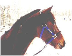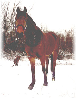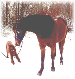 Der Hengst hatte die gleiche Farbe wie meine Hunde. Er zeigte sich in ihrer Nähe als liebevoller Kamerad. Selbst meine Vierbeiner bemerkten sehr schnell, daß sie sich vor diesem großen ETWAS nicht zu fürchten brauchten und näherten sich ihm immer mehr.