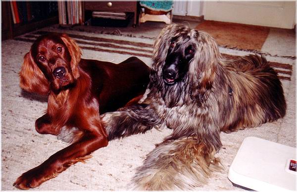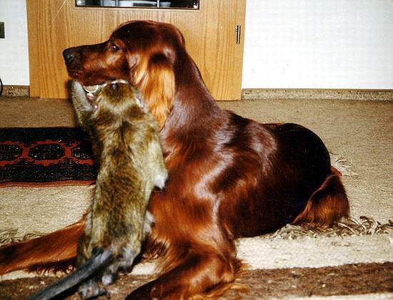 Bis zu meiner 8. Lebenswoche besuchte mich mein Frauchen mit ihrem Setterrüden BINO regelmäßig bei meinem Züchter. Meine Mutter ABAQUAIL of Innishargie und mein Frauchen schlossen von Anfang an Freundschaft...., aber ich will der Reihe nach erzählen: Am Tag, als ich genau 8 Wochen wurde, holte mich mein Frauchen ab. Im neuen Heim gab es viel Neues, andere Hunde, Affen, Schildkröten ... Ich freundete mich schnell mit allen an (wie es ja oben auf dem Foto zu erkennen ist). Es dauerte nicht lange, bis auch meine Mutter ABAQUAIL in unser Heim einzog.